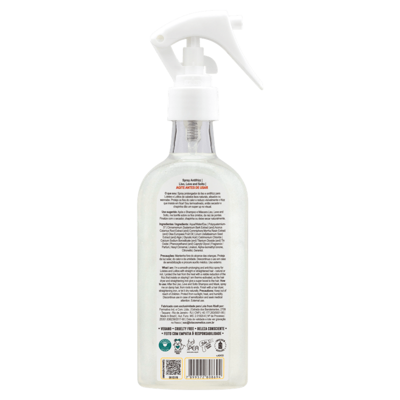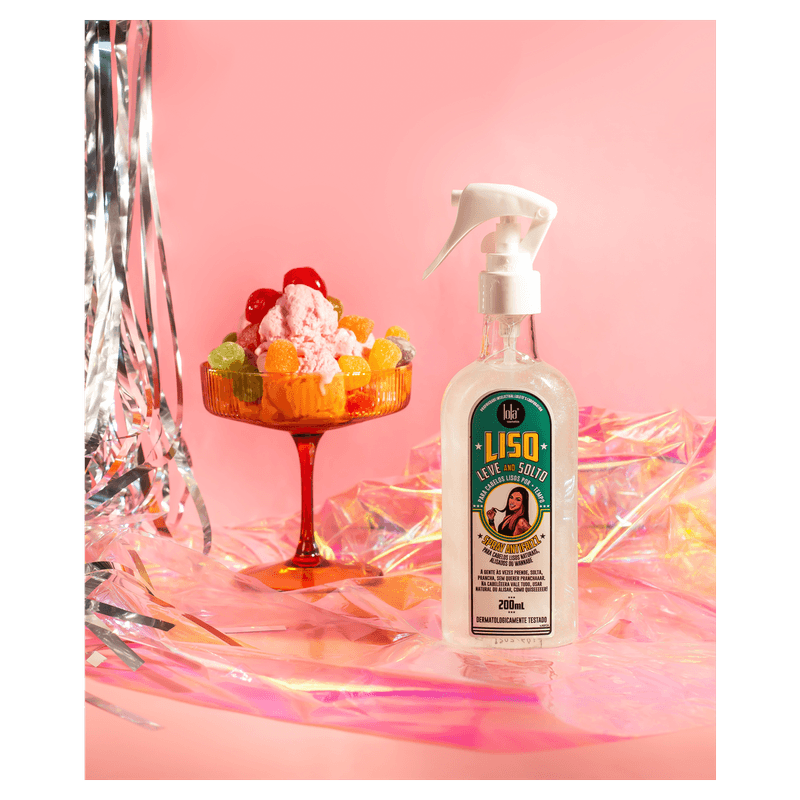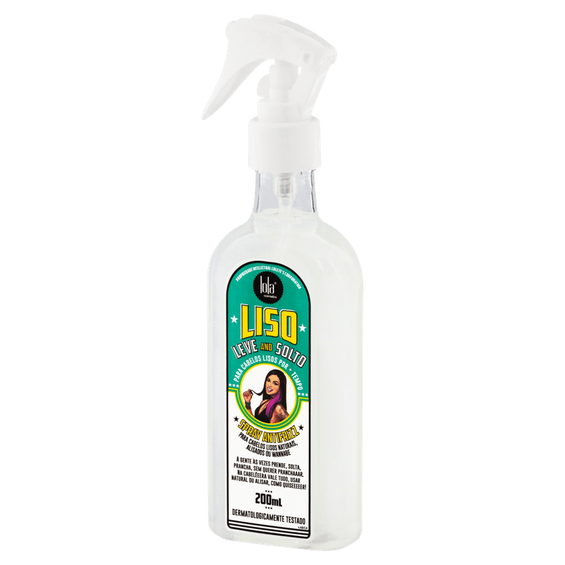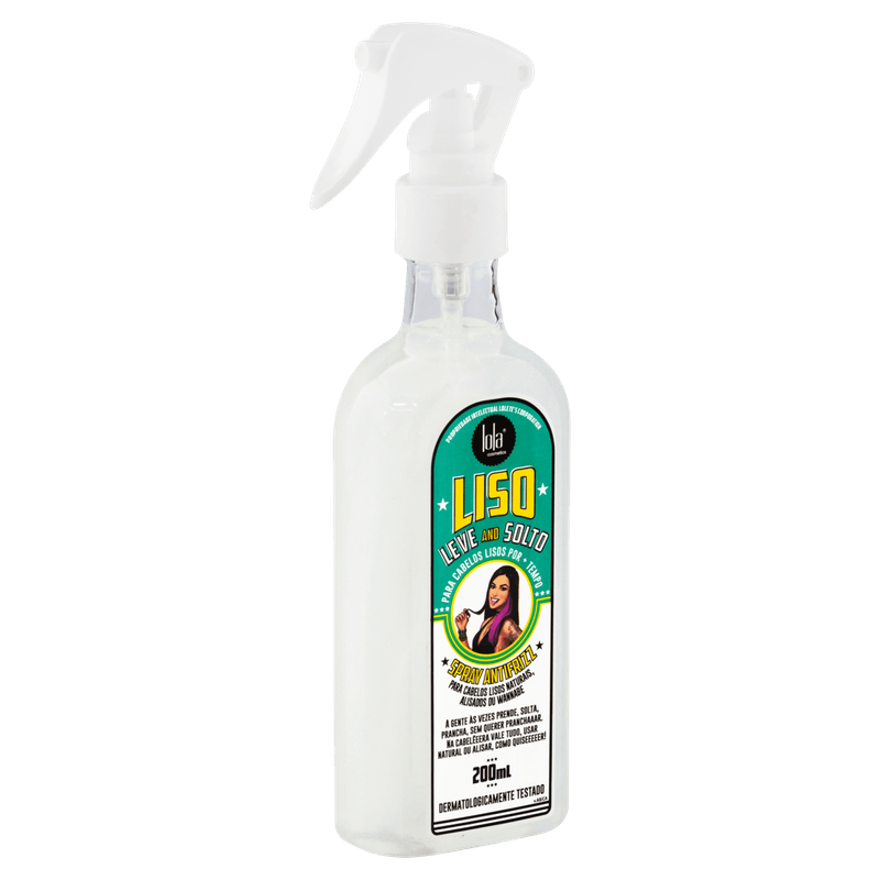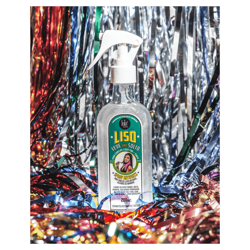 O Spray Antifrizz Liso, Leve e Solto de Lola Cosmetics te proporciona uma proteção térmica e solar que deixa seus cabelos mega brilhantes, além de seu efeito antifrizz para uso diário, perfeito para cabelos lisos naturais ou alisados, ajudando no alinhamento dos fios e prolongando o efeito liso. Além de prolongar o efeito liso e a redução de frizz em seus cabelos, sua composição é rica em tamarindo, canela e óleo de oliva, que são hidratantes que ajudam no fortalecimento e no crescimento dos fios.