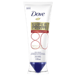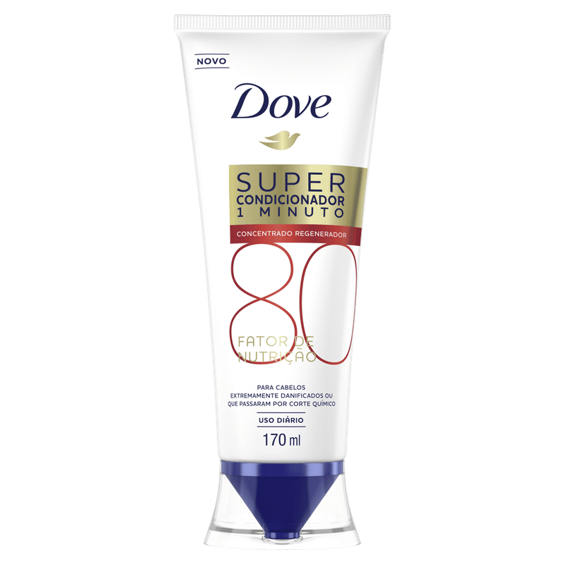 "Super Condicionador Dove 1 minuto cuida dos cabelos que precisam de cuidados mais profundos. Seu fator de nutrição 40 é indicado para cabelos expostos a danos diários e fatores do meio ambiente como vento e poluição. Combinação entre Glicerina e Silicone
