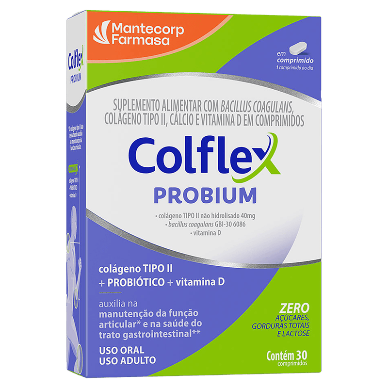 O Suplemento Colflex Probium é um produto em comprimidos revestidos, indicado para suplementação e complementação nutricional, focado na manutenção da função articular e na saúde do trato gastrointestinal.