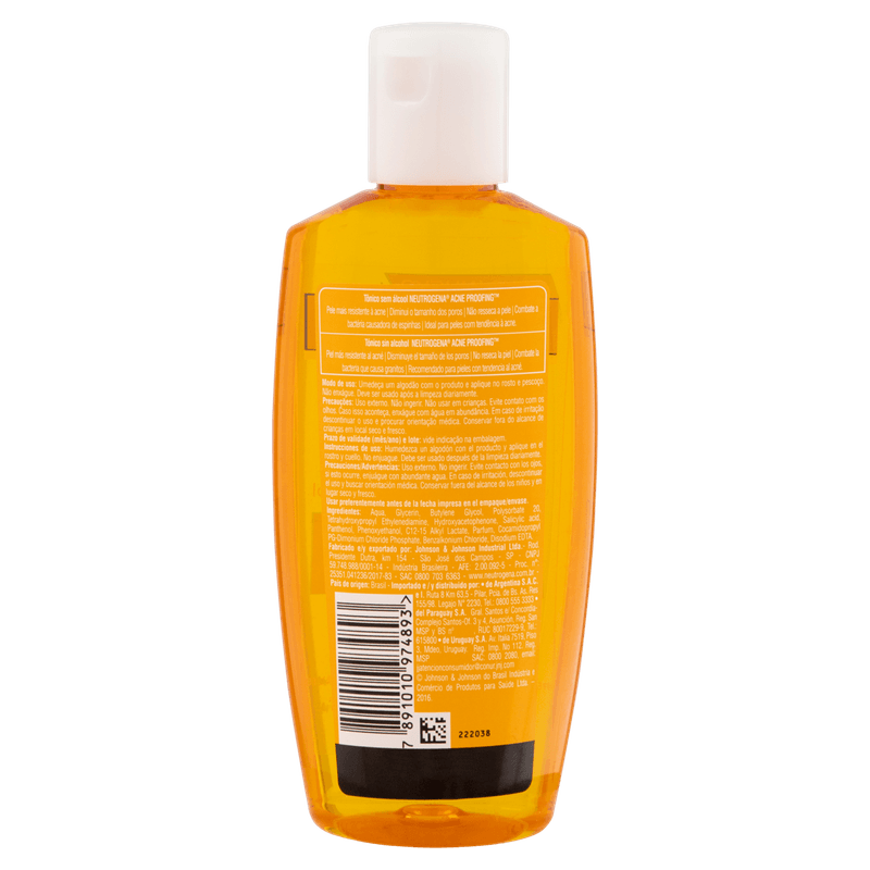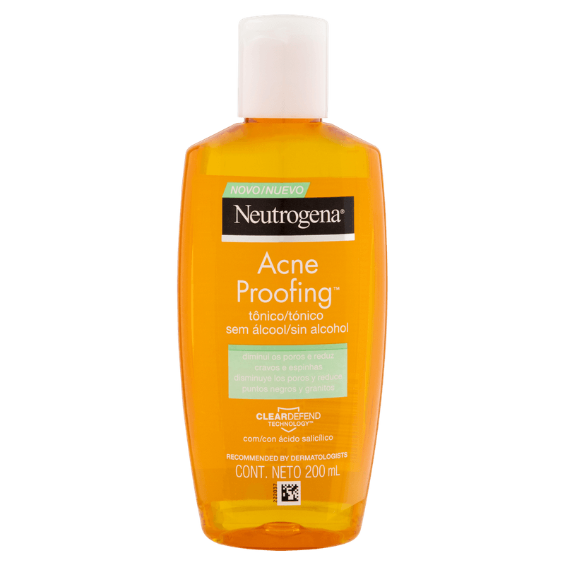 O Tônico sem álcool Neutrogena Acne Proofing diminui os poros e reduz cravos e espinhas, limpa, reduz e trata a acne profundamente. Ao mesmo tempo que não agride a barreira natural da pele. Estimulando a construção de um escudo natural que previne novas crises de acne. Tônico sem álcool, que diminui o tamanho dos poros e não resseca a pele, reduz cravos e espinhas. O tônico facial Acne Proofing de Neutrogena limpa, reduz e trata a acne profundamente ao mesmo tempo que não agride a barreira natural da pele, estimulando a construção de um escudo natural que previne novas crises de acne. Com microesferas esfoliantes e ácido salicílico, remove o excesso de sebo e desobstrui os poros. Recomendado para todos os tipos de pele.