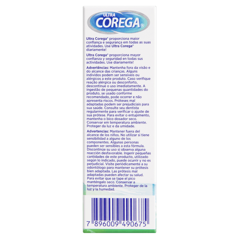 Advertência: Mantenha fora da visão e do alcance das crianças. Alguns indivíduos podem ser sensíveis ou alérgicos a este produto. Caso verifique reação alérgica ou desconforto, descontinue o uso imediatamente. Próteses mal adaptadas podem ser prejudiciais para sua saúde. Comece com pouco pó, usando mais, se necessário. O excesso pode ocasionar transbordamento. Podem ser necessárias algumas aplicações até achar a quantidade ideal. Aplique uma vez ao dia para garantir adesão. Se necessário repetir aplicação, procure orientação do dentista. A ingestão de pequenas quantidades do produto, se usado conforme recomendado, pode ocorrer e não apresenta riscos.