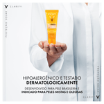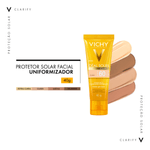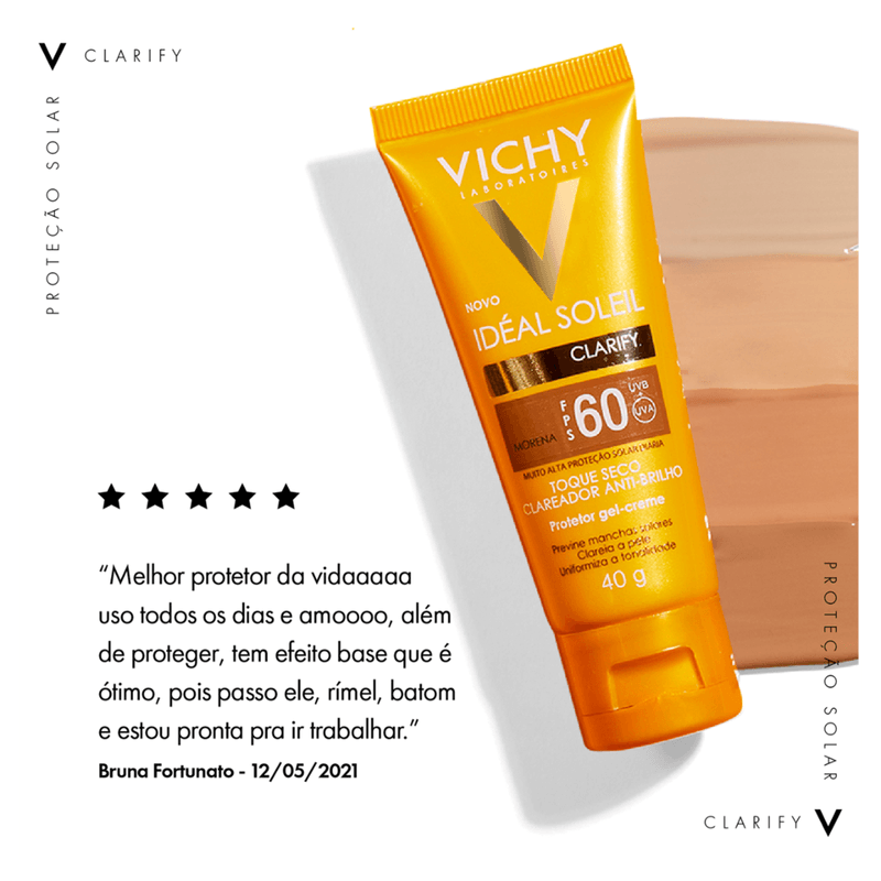 O Vichy Protetor Solar Facial Idéal Soleil Clarify Cor Clara FPS 60 é um protetor solar em gel creme com toque seco, indicado para peles claras, mistas e oleosas. Oferece alta proteção contra os raios UVA, UVB e luz visível, além de uniformizar o tom da pele e ajudar na prevenção de manchas solares.