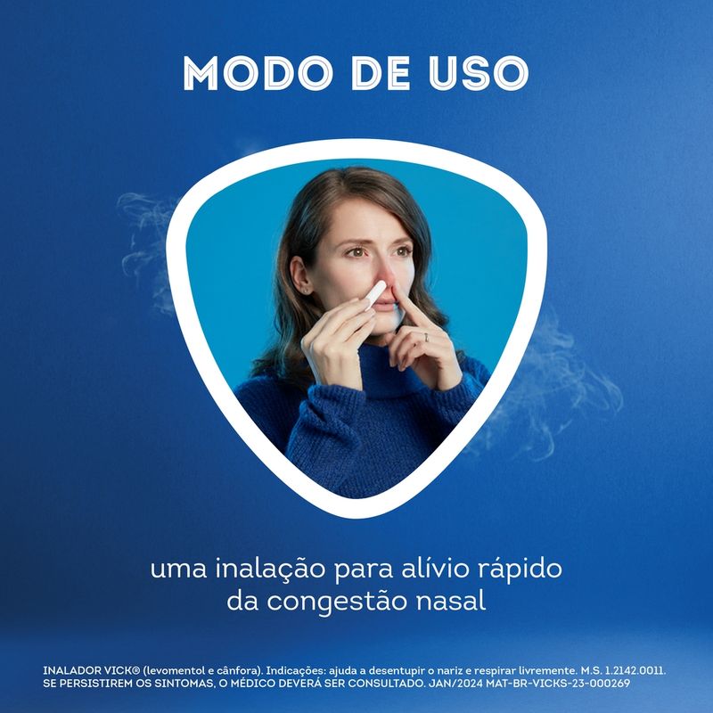 O Vick Inalador Descongestionante Nasal 0,5g é indicado para o alívio da congestão nasal causada por resfriados e alergias. Atua diretamente nas vias aéreas superiores, proporcionando sensação de desobstrução nasal rápida e temporária.