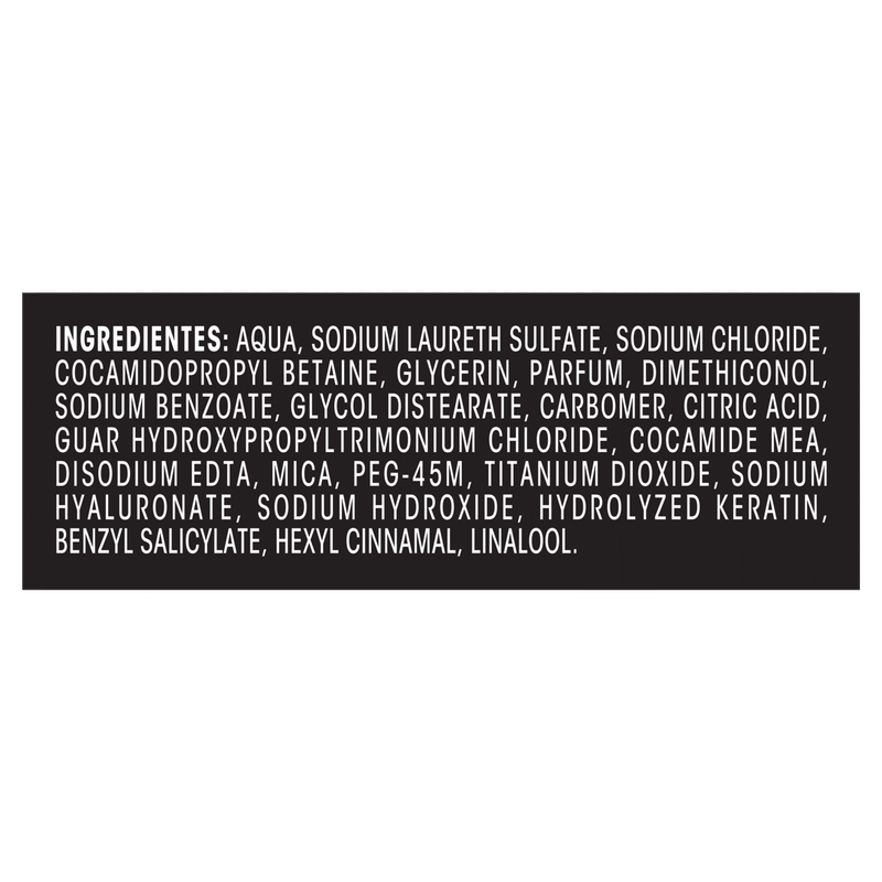 Composição: Aqua, sodium laureth sulfate, sodium chloride, cocamidopropyl betaine, glycerin, parfum, dimethiconol, sodium benzoate, glycol distearate, carbomer, citric acid, guar hydroxypropyltrimonium chloride, cocamide MEA, disodium EDTA, mica, PEG-45M, titanium dioxide, sodium hyaluronate, sodium hydroxide, hydrolyzed keratin, benzyl salicylate, hexyl cinnamal, linalool.